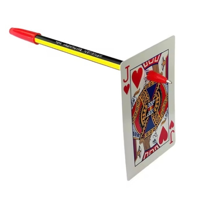 マジシャンは、トランプの束から1枚のカードを抜きだし、ディスプレイスタンドの窓に入れます。おまじないをかけると・・・カードの中央部分を引き出すことができます。カードは完全にカットされています。中央部分を押し戻すと、カードは瞬時に元の状態に戻ります。最後に、カードを観客に手渡して確認してもらいます。