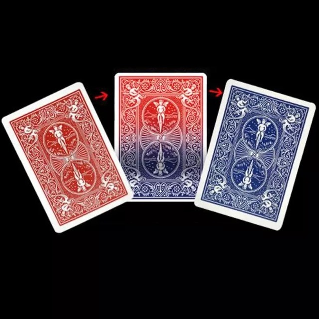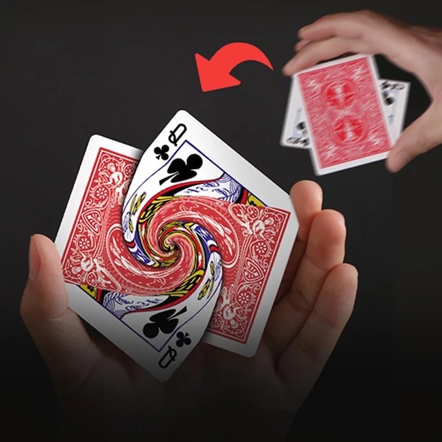 2枚のトランプをクロスするように重ねます。ゆっくりと回していくと…融合してしまいます。その後、再び2枚のトランプに戻ります。