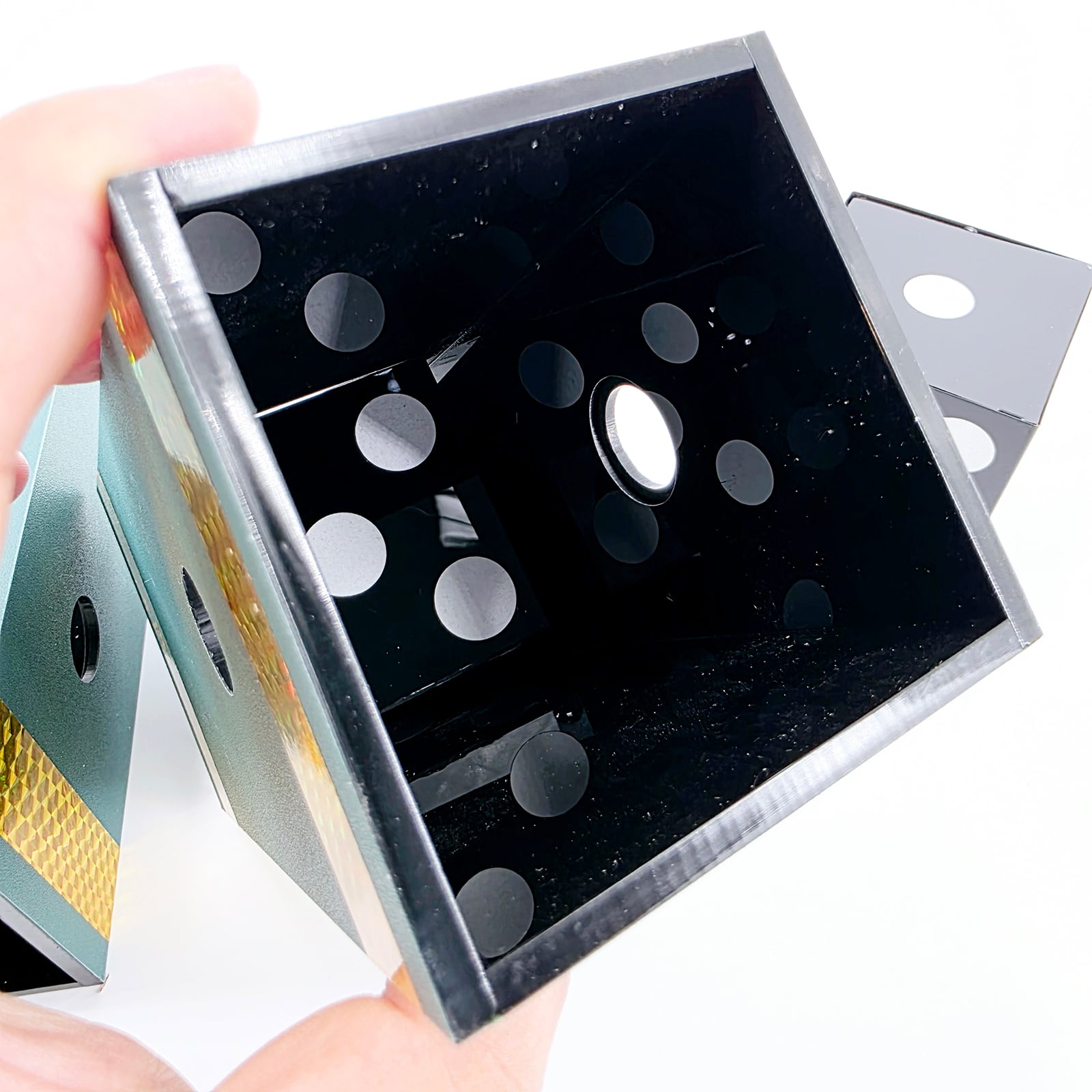 ステージで演じられる不思議なダイスの貫通マジックです。2つの角型の筒と大きなダイスみせ、筒にダイスを通してみせます。1つの筒をテーブルに置き、透明なプレートを乗せます。そして、その上にもう1つの筒を乗せます。ダイスを上にある筒の上から入れます。マジシャンが筒の上からフッと息を吹きかけると・・・ダイスはプレートを貫通して下の筒から落ちてきます!