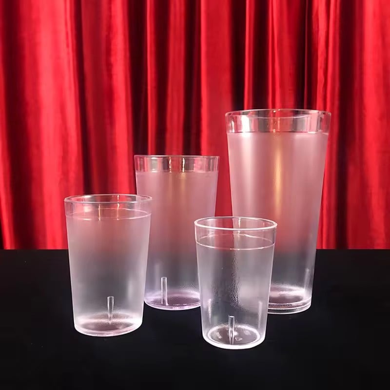 4つのサイズが異なるコップがあります。マジシャンは一番小さなコップに牛乳をいっぱいに注ぎます。そしてその牛乳をもうひとまわり大きなコップに注ぐとなんと牛乳はその大きなコップいっぱいになります。次にもう1つ大きなコップに牛乳を注ぎますが、その大きなコップもいっぱいになります。最後に一番大きなコップに牛乳を注ぐと、やはりこれもいっぱいになってしまいます。
