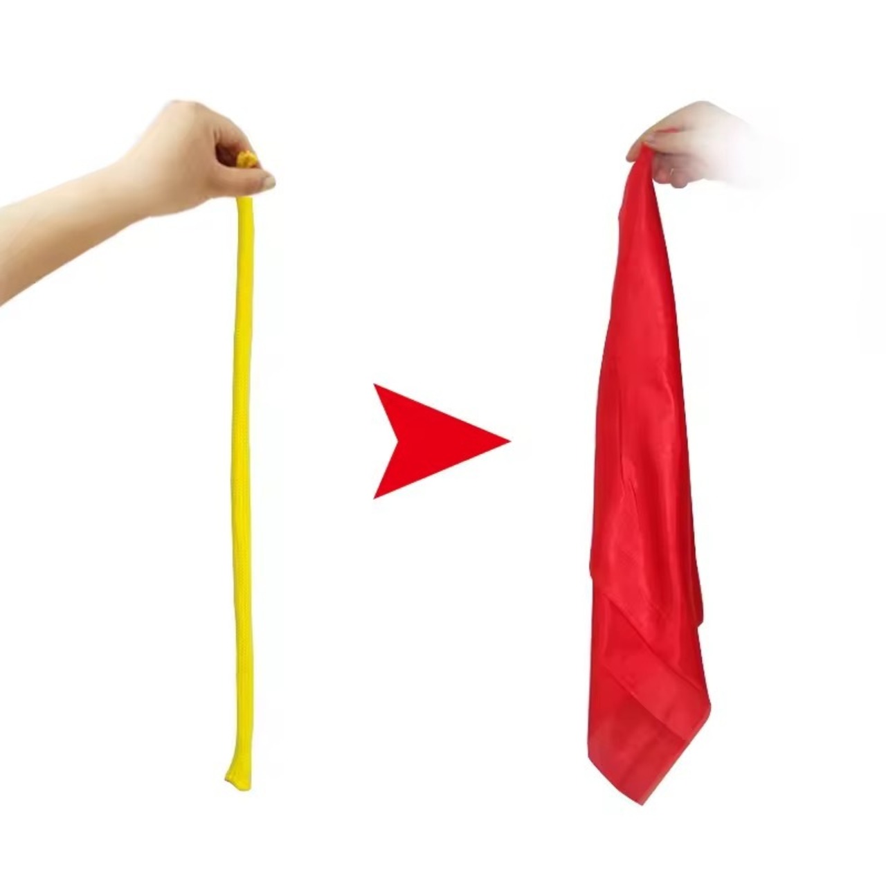 1本の黄色い柔らかいロープをみせます。ロープを少し立てるとピーンと直立します。今度はもう少し長くロープを立てますが、やはりピーンと直立します。マジシャンは「実は、見えない糸があるんです」といい手で作ったハサミで糸を切ると、ふにゃふにゃのロープに戻ります。もう一度ロープを立てるのかと思ったら、ロープは瞬時に赤いスカーフに変化します!