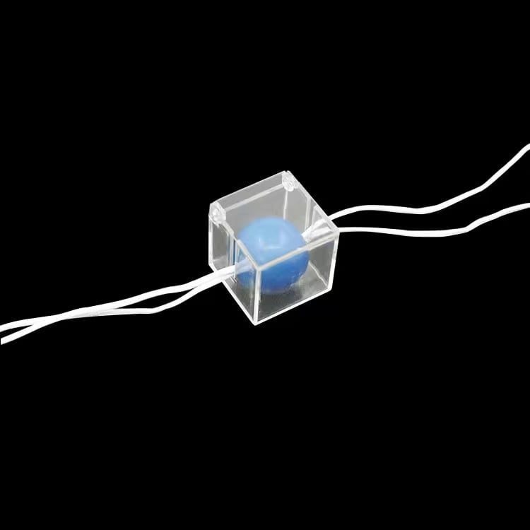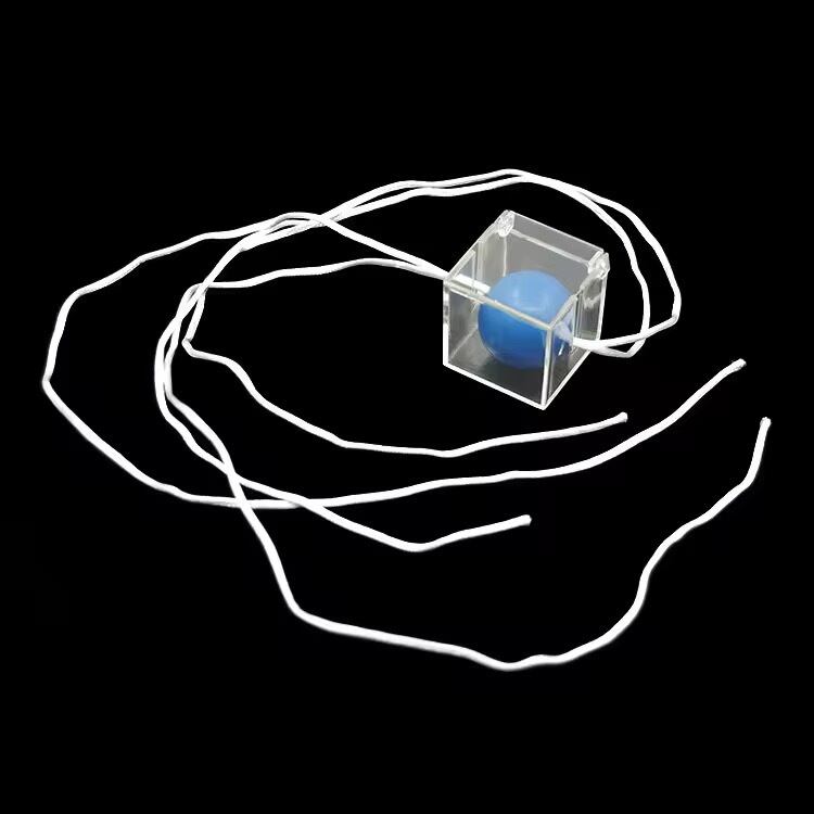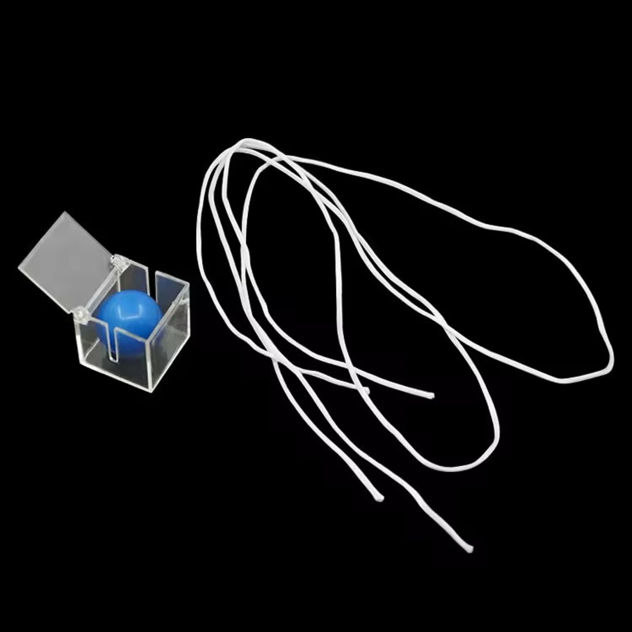 小さな穴のあいたボールに2本の紐が通っています。それらを透明の箱に入れてしまいます。さらに観客に手でしっかりと押さえてもらいます。次に紐の左右を観客の手ごと結んでしまいます。おまじないをかけると・・・紐はボールも箱も観客の手も貫通して取れてしまいます。
