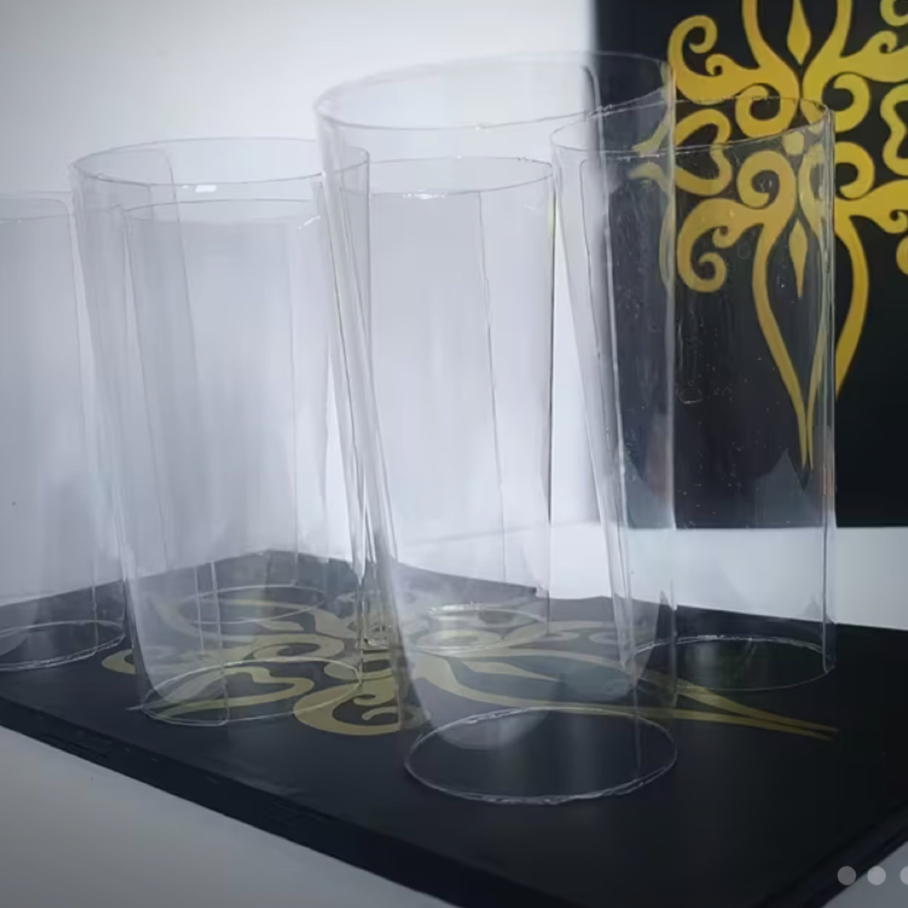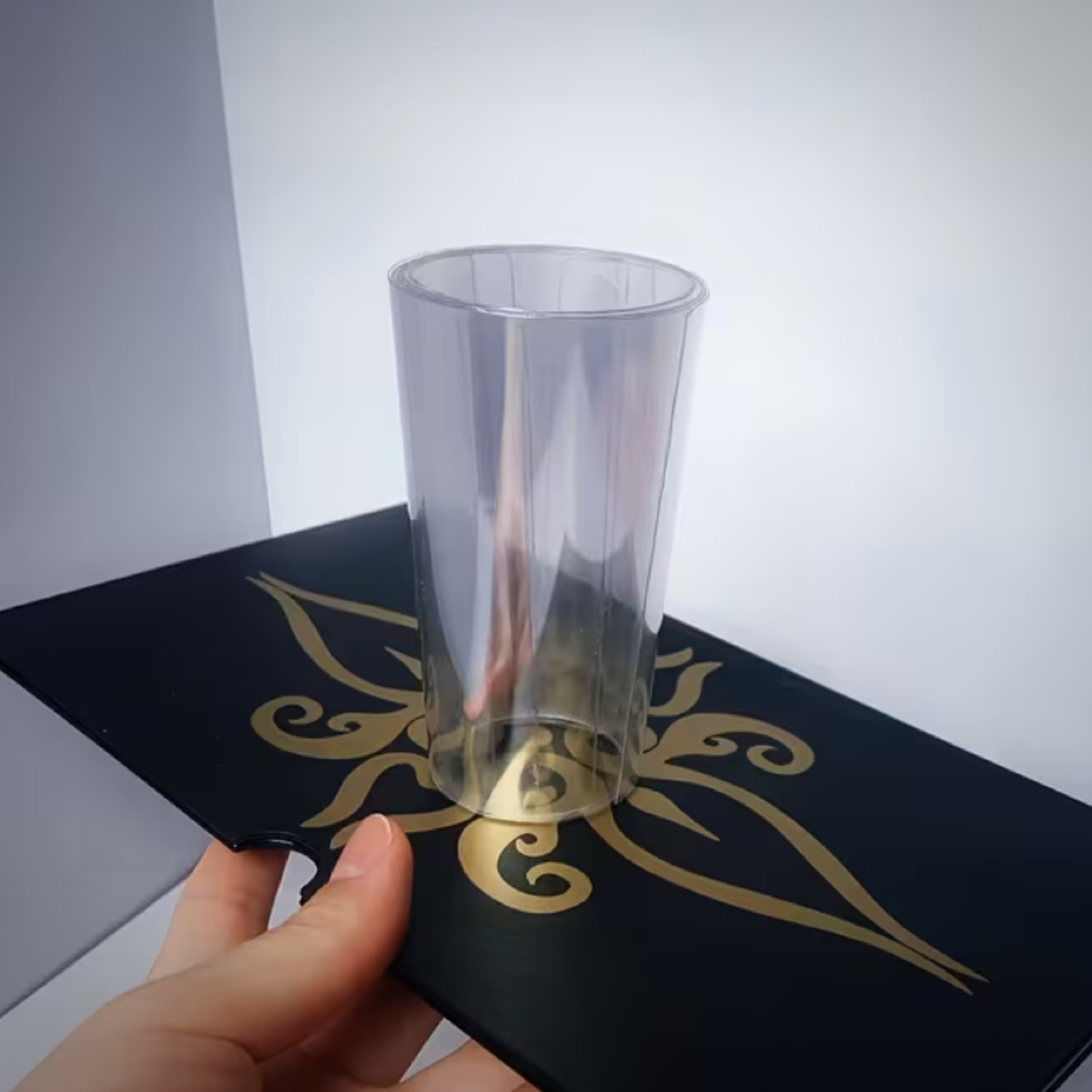 2枚のボードを取り出し、裏と表を観客によく見せます。マジシャンがボードを重ねると、なんとそこにコップが現れます!再び、マジシャンはボードの裏表をあらためますが、またもや出現します!そして次々と何個も何個も出現し、なんと合計6個ものコップが出現します!