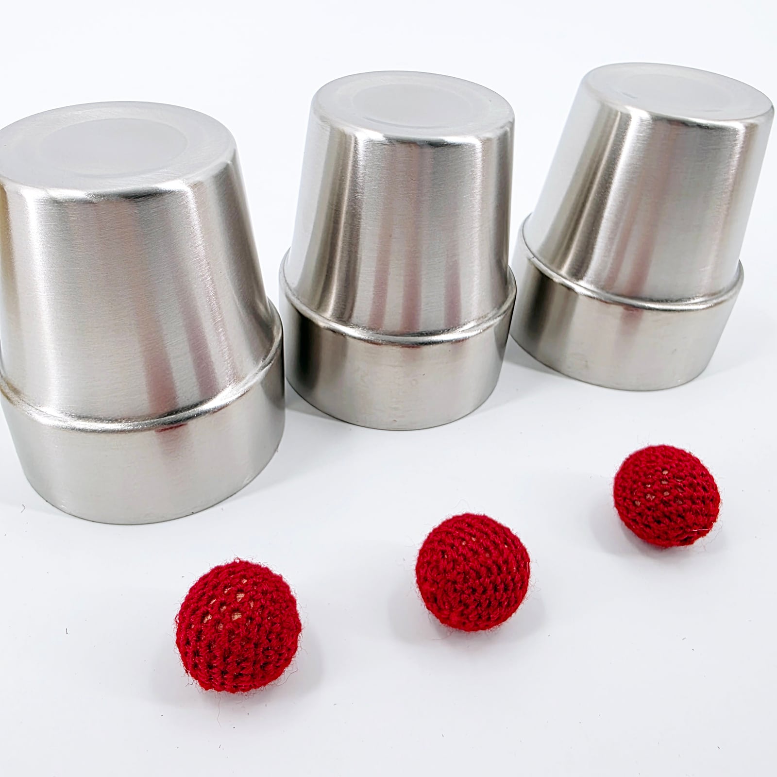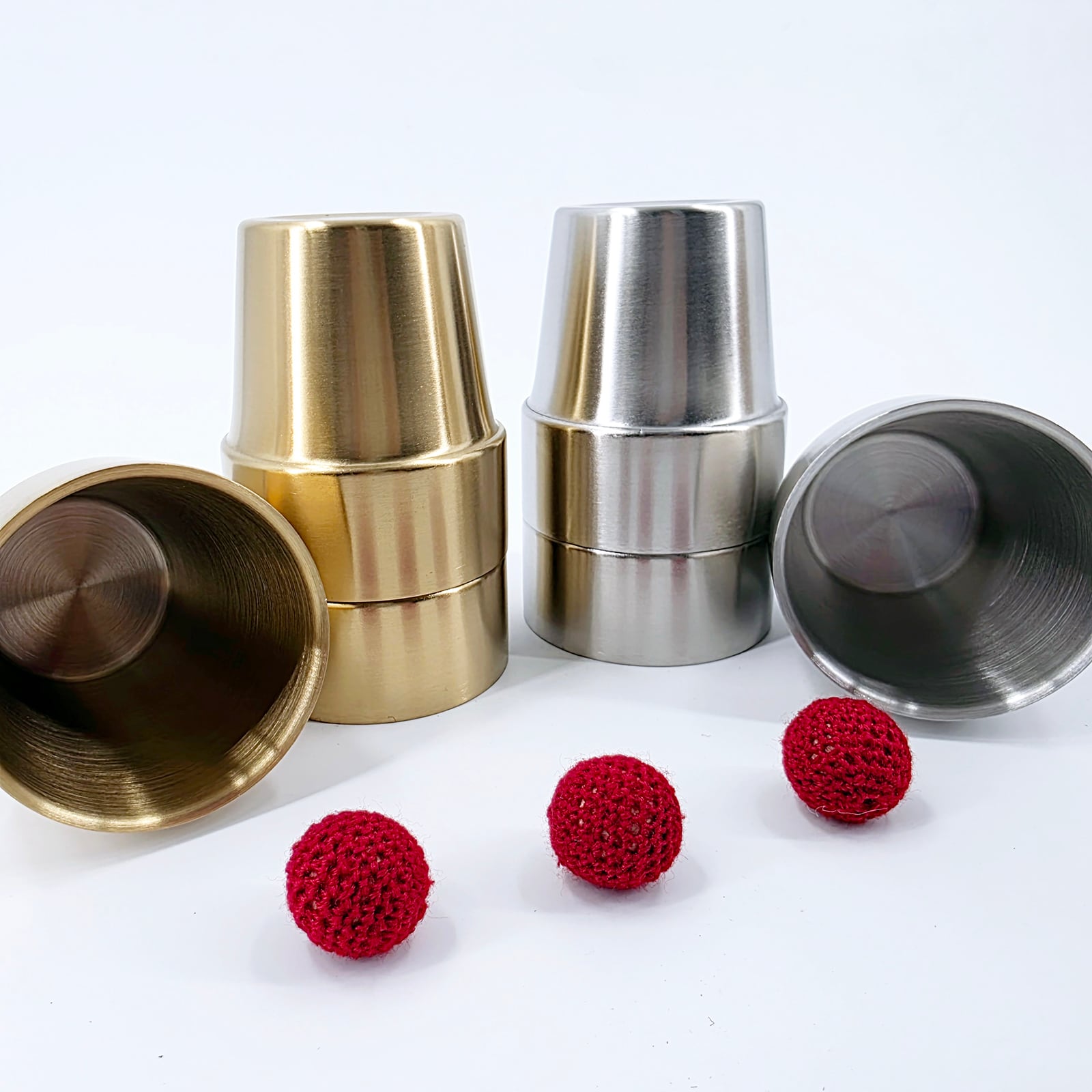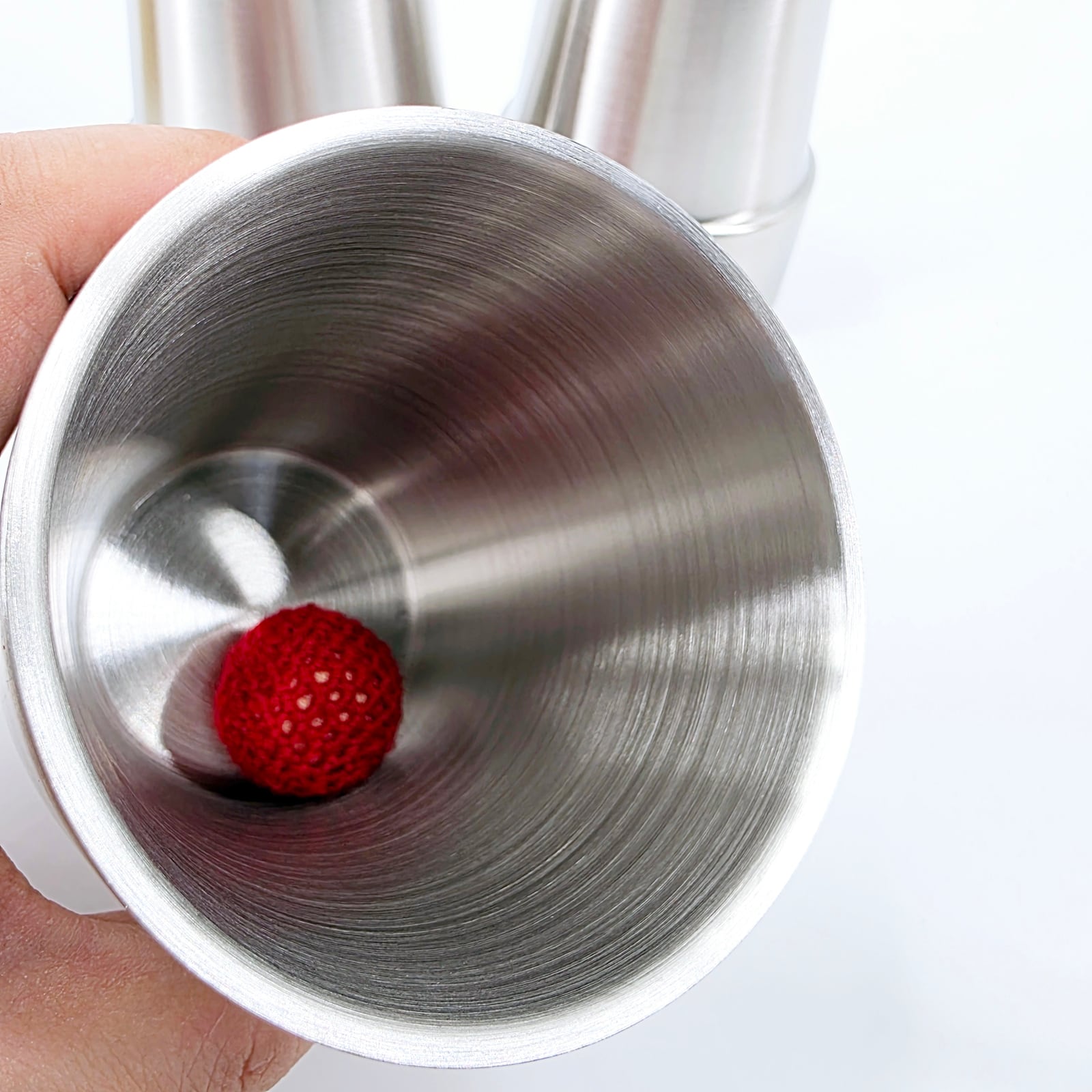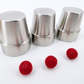 3つのカップと3つの玉があります。テーブルに3つの金属製のカップをふせて置きます。そして真ん中のカップの上に玉を1つ乗せます。左右のカップをその上にカップに重ねます。そして、上から指で 「トン!」 と軽く叩くと・・・玉はカップの底を通り抜けて下から出てきます!もちろんカップの底に穴は開いていません。残り2つの玉も次々とカップの底を通り抜けていきます!