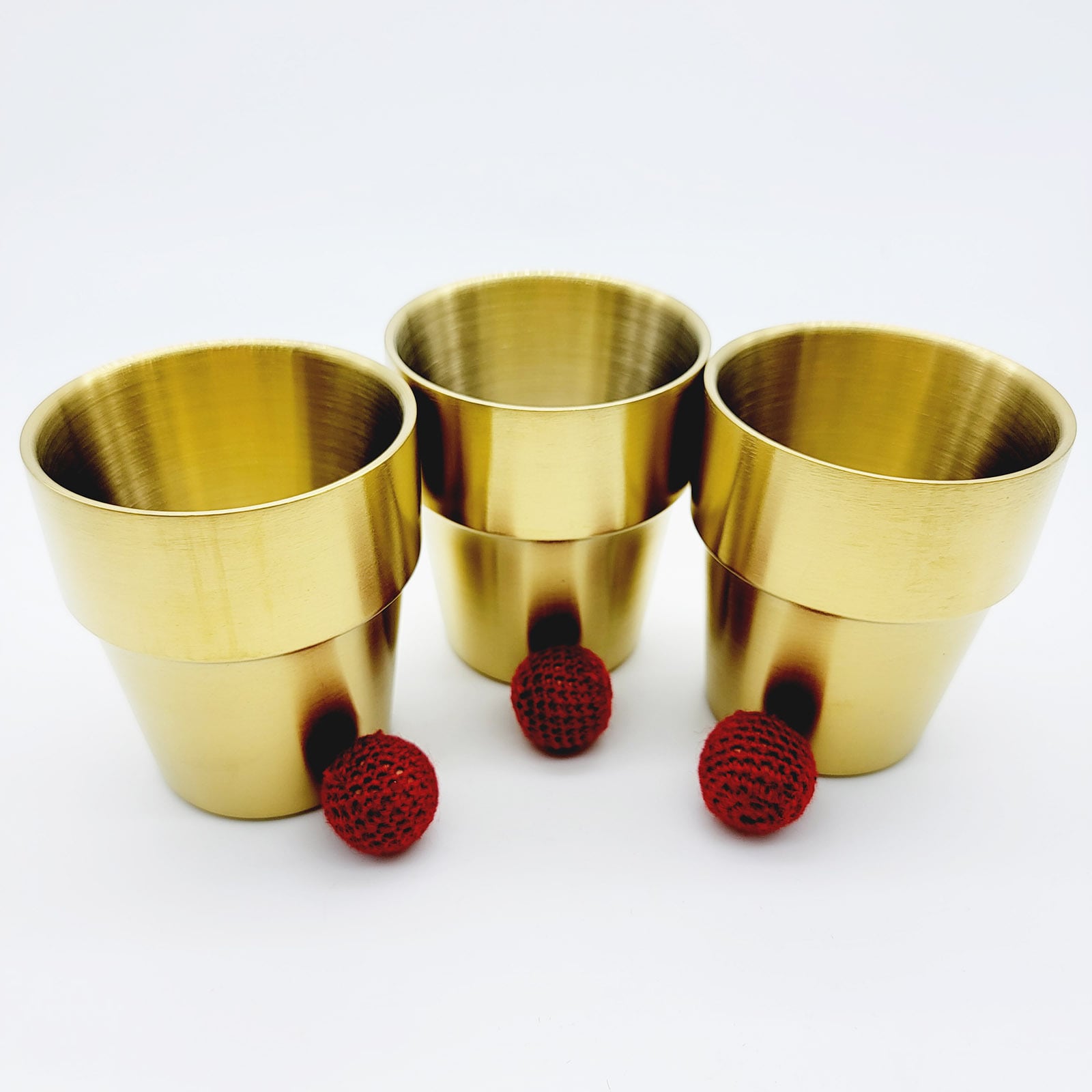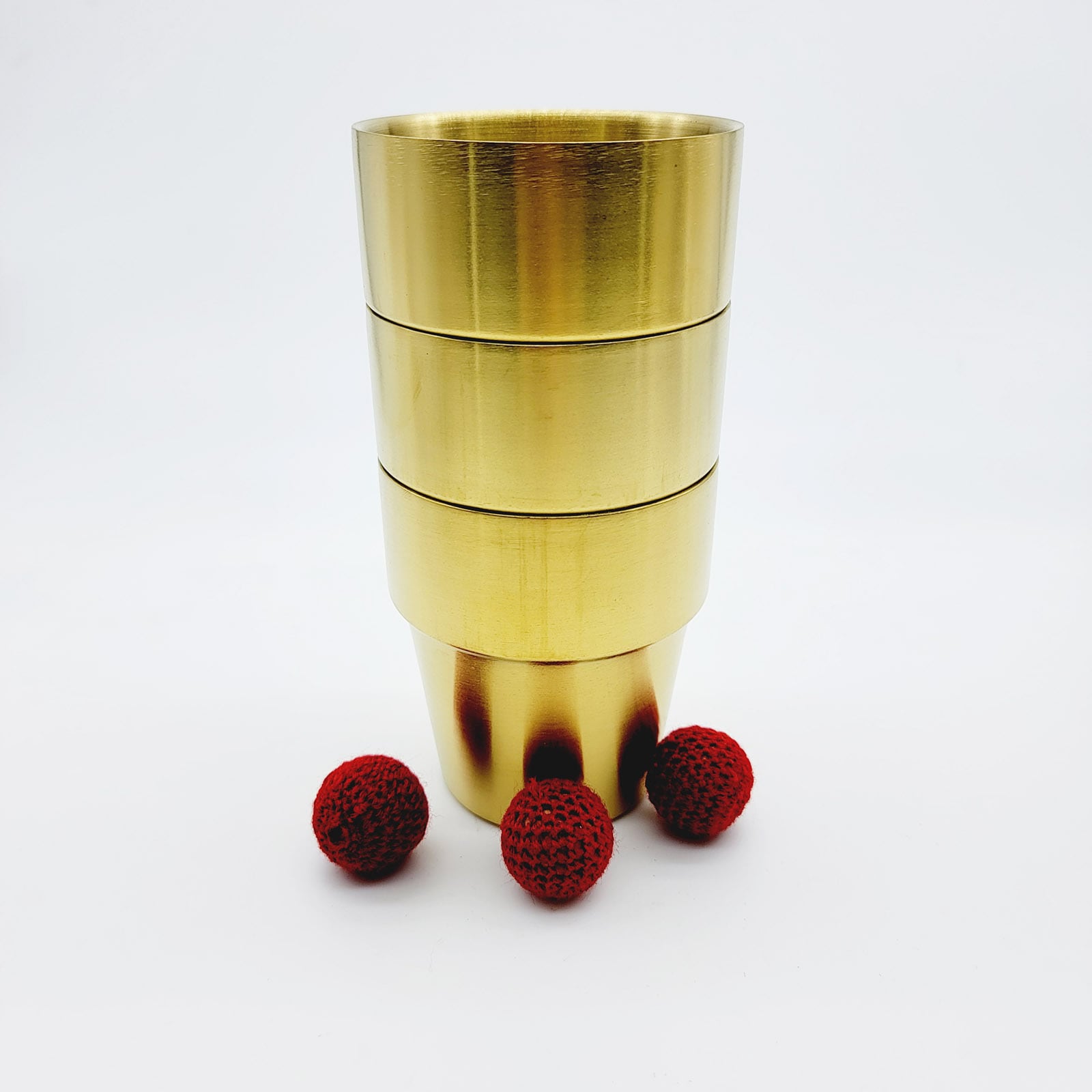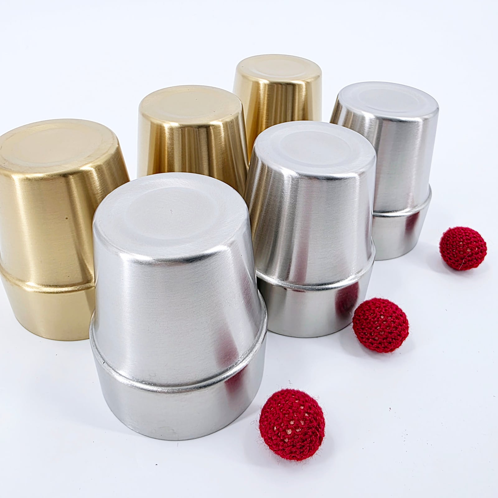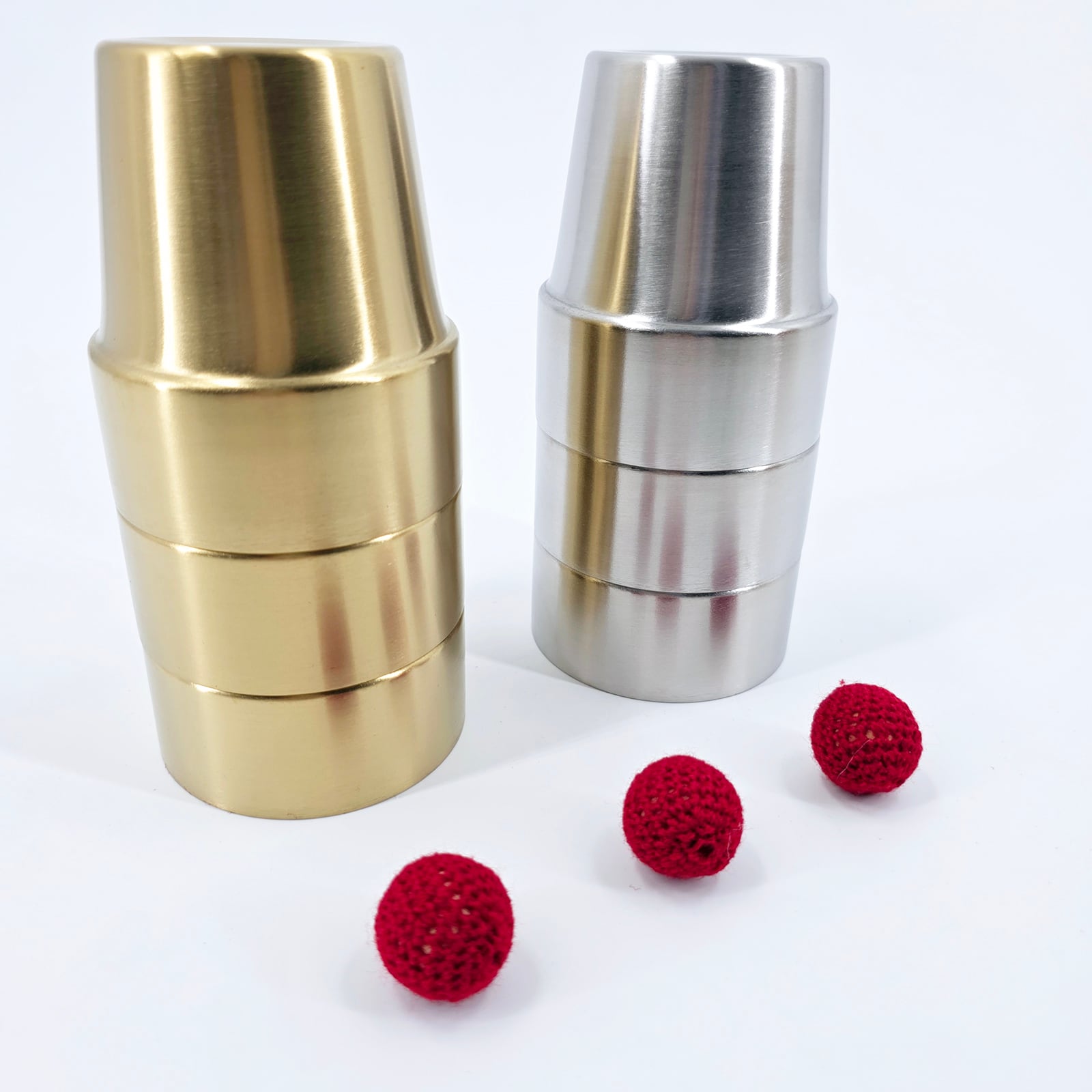 3つのカップと3つの玉があります。テーブルに3つの金属製のカップをふせて置きます。そして真ん中のカップの上に玉を1つ乗せます。左右のカップをその上にカップに重ねます。そして、上から指で 「トン!」 と軽く叩くと・・・玉はカップの底を通り抜けて下から出てきます!もちろんカップの底に穴は開いていません。残り2つの玉も次々とカップの底を通り抜けていきます!