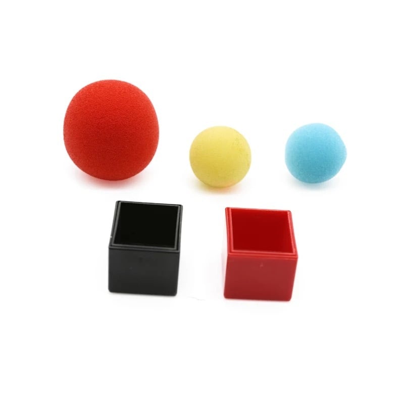 赤箱があり、中には黒箱が入っています。黒箱の中には、青色のボールが入っています。まず、外側の赤箱が、内側に入っていた黒箱の中に入ってしまいます。そして、最初と同じことが始まります。黒箱の中には、赤箱が入っています。その赤箱の中には、黄色のボールが入っているのです。外箱だった黒箱が、今度は内箱だった赤箱に収まってしまいます。そしてまた最初に戻ります。赤箱があります。赤箱には黒箱が入っています。そして黒箱には、赤いボールが出現します。