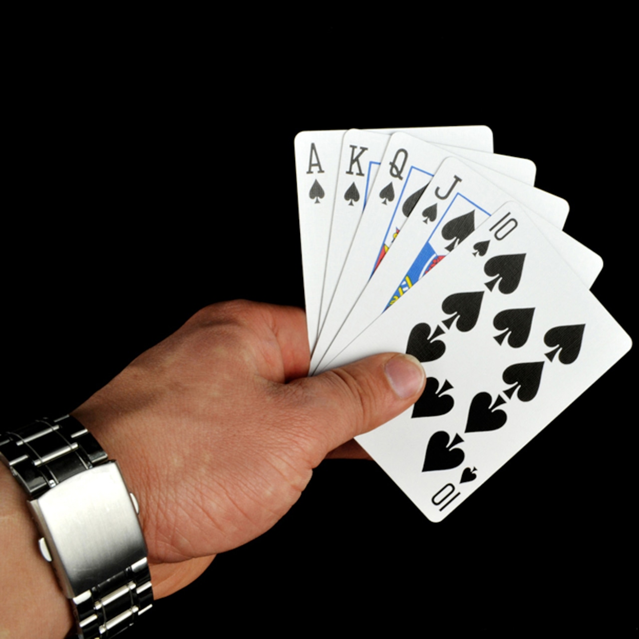 ポーカーだと何も揃っていないバラバラの状態です。しかし、手品師がトランプを弾くと…一瞬で!10、J、Q、K、Aに変わります。ポーカー最強の手「ロイヤルストレートフラッシュ」です。