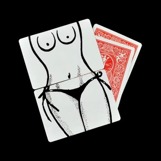 3枚のカードを取り出します。 カードにはセクシーな美女の顔の部分、胴の部分、腿の部分が描かれています。 これらのカードを裏向きにして、観客に胴のカードを探してもらいますが、当たりません。 そして最後に美女だと思われていたカードが…衝撃のラストが待っています。